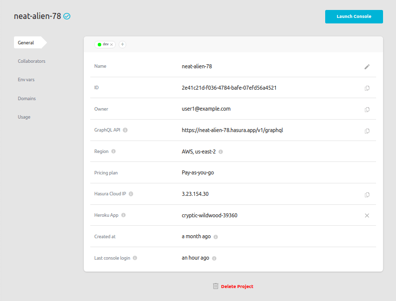 • Click Launch Console to open the Hasura console in your browser. The Monitoring tab lets you use the Pro features that Hasura Cloud has set up for you.