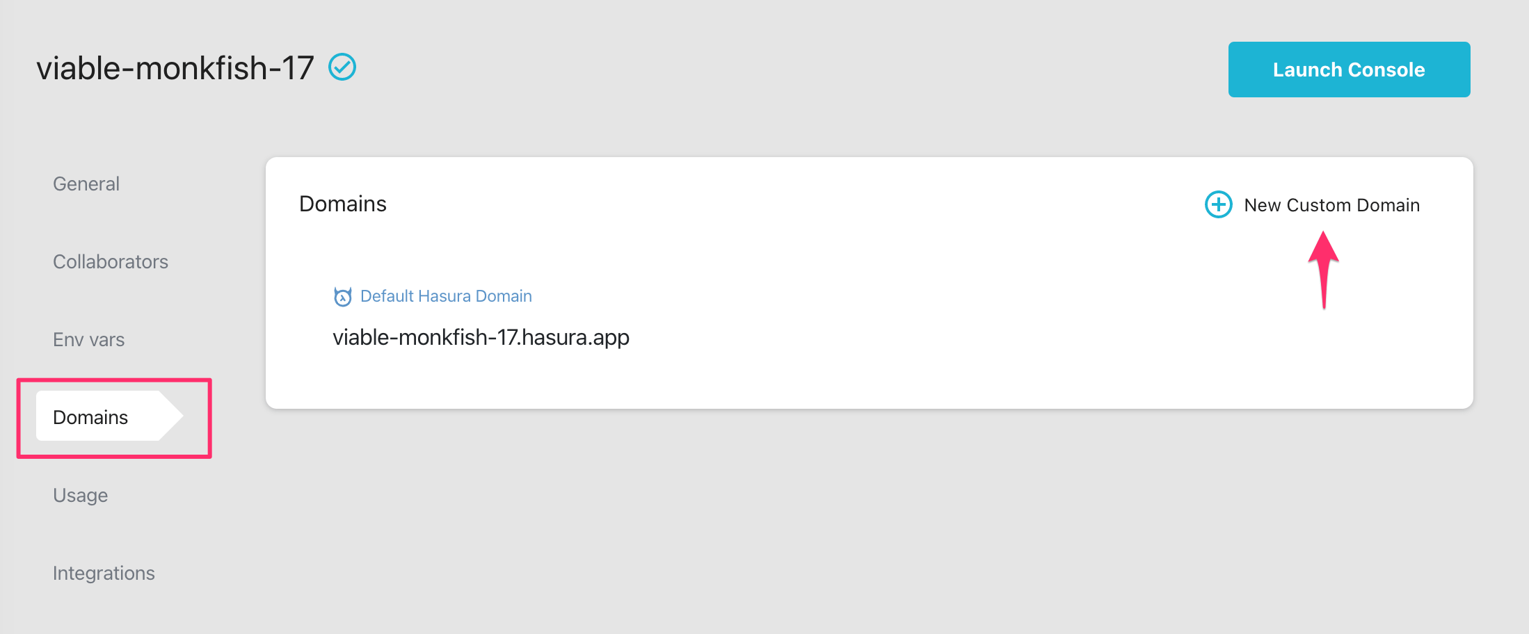 tab, you can see the default Hasura domain, and you have the possibility to add custom domains.