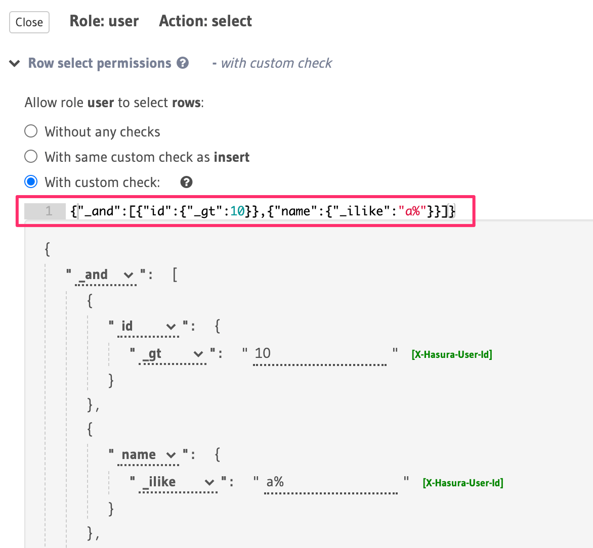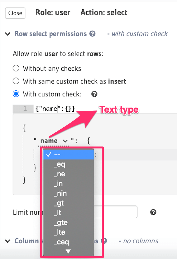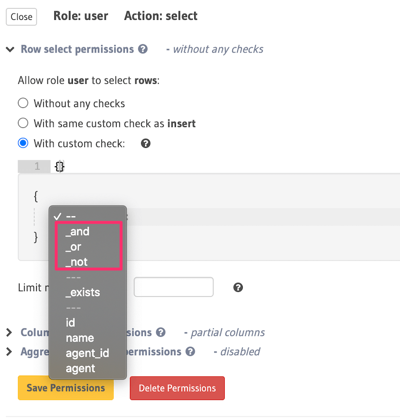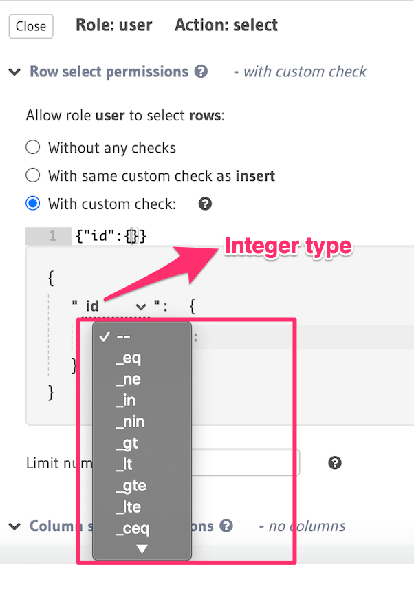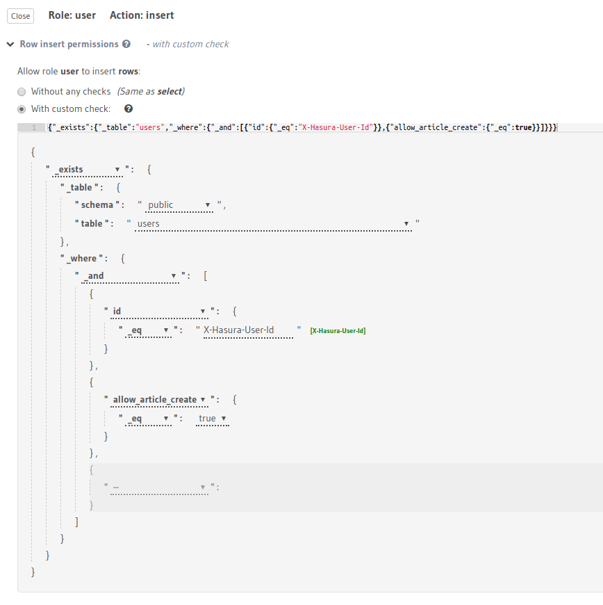 Let’s take a look at the different configuration options available to define a permission rule. Permission rules are defined for each role, table, operation (insert, select, update, delete) by using the console or the metadata APIs for permissions.