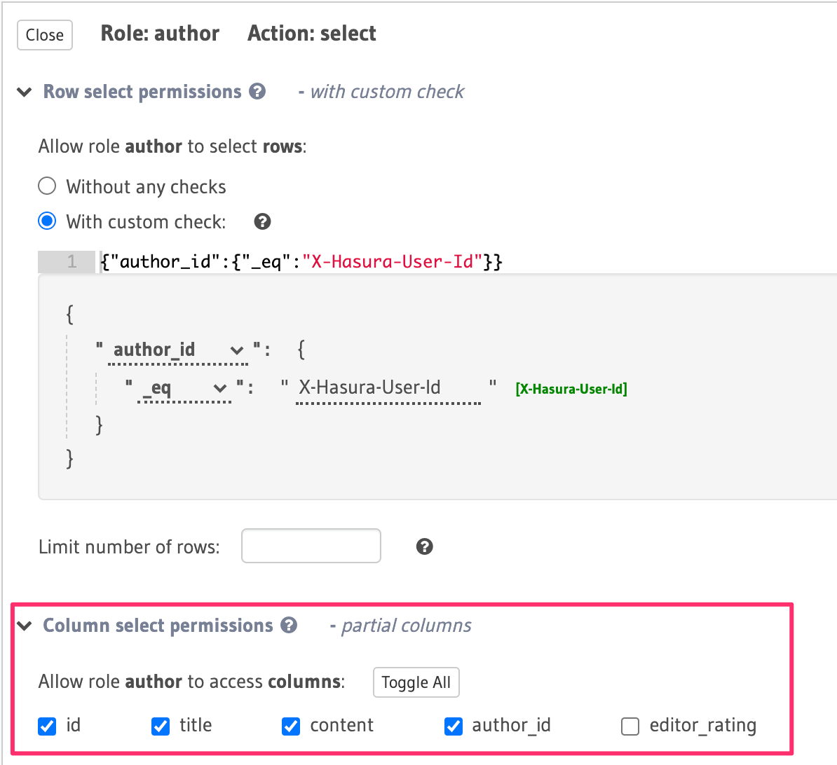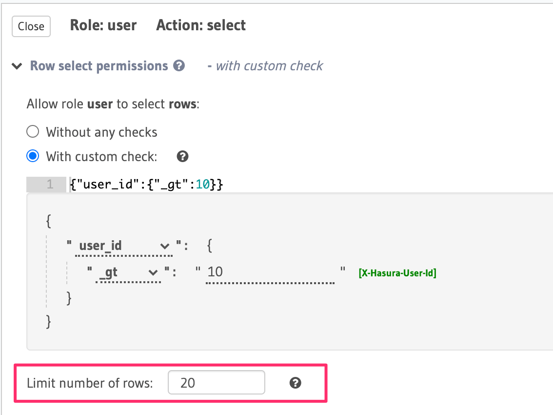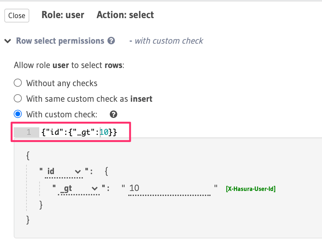 Let’s take a look at the different configuration options available to define a permission rule. Permission rules are defined for each role, table, operation (insert, select, update, delete) by using the console or the metadata APIs for permissions.
