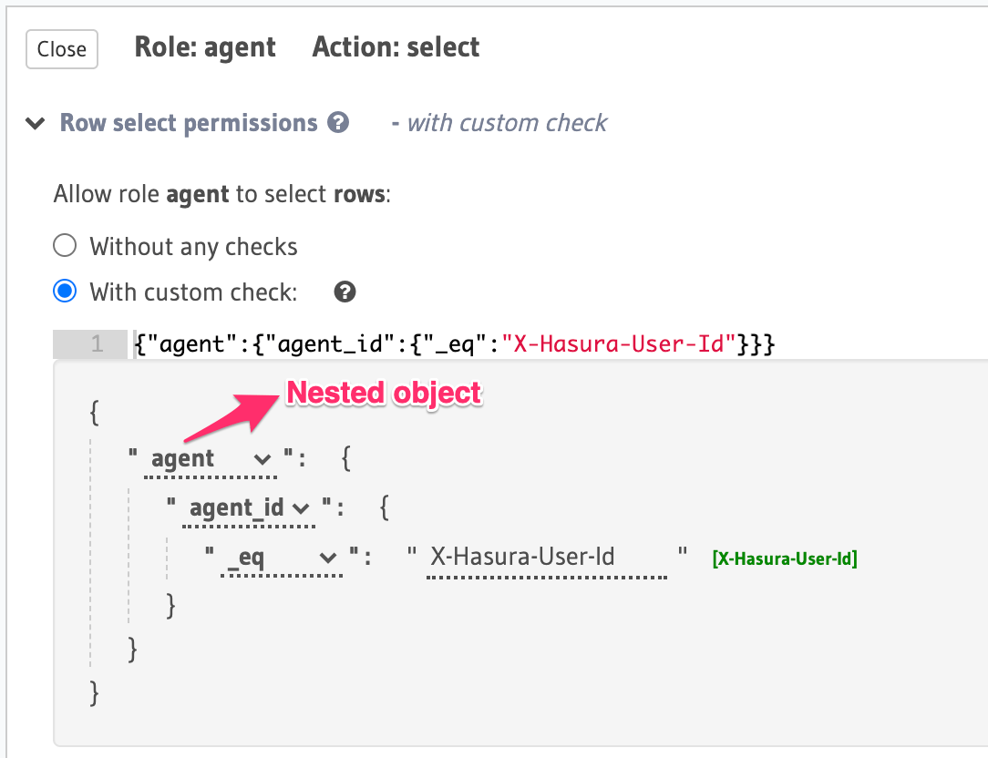 Row-level permissions are defined using operators, static values, values in columns (including those in related tables or nested objects) and session variables.