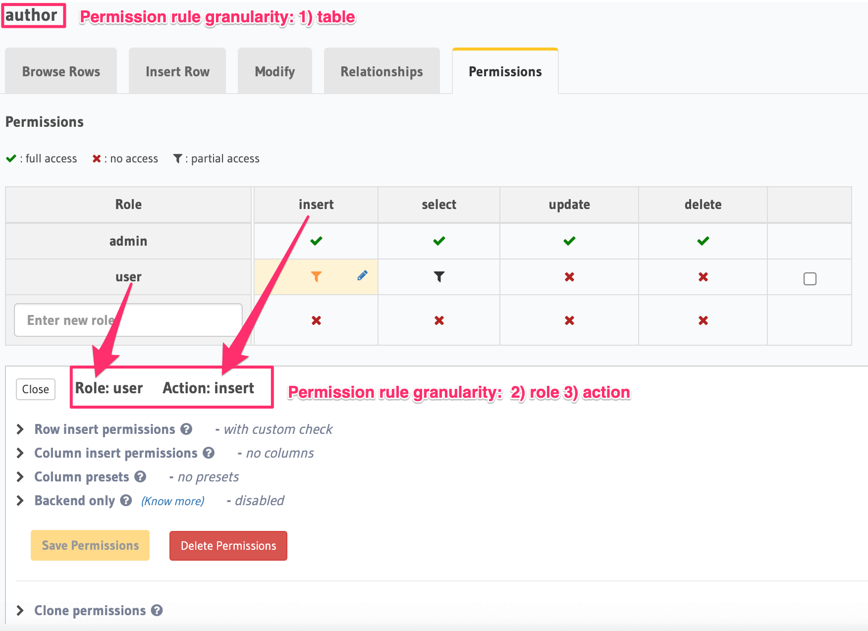 Access control rules in Hasura are defined at a role, table and action (insert, update, select, delete) level granularity: