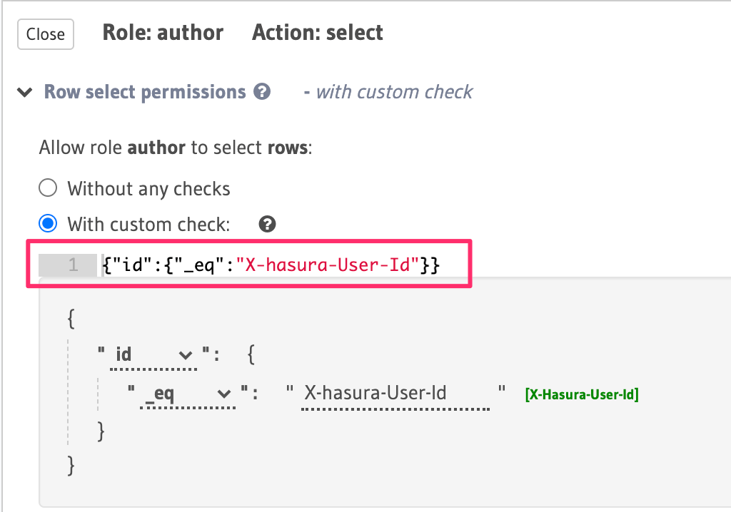 {"id":{"_eq":"X-Hasura-User-Id"}}