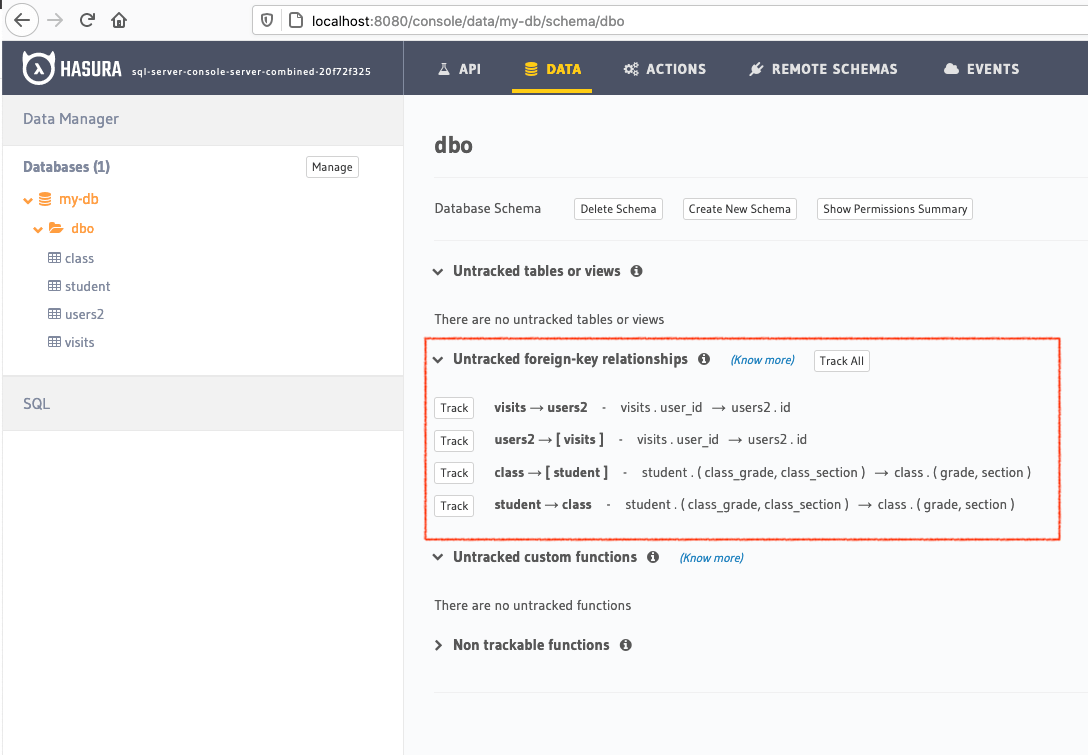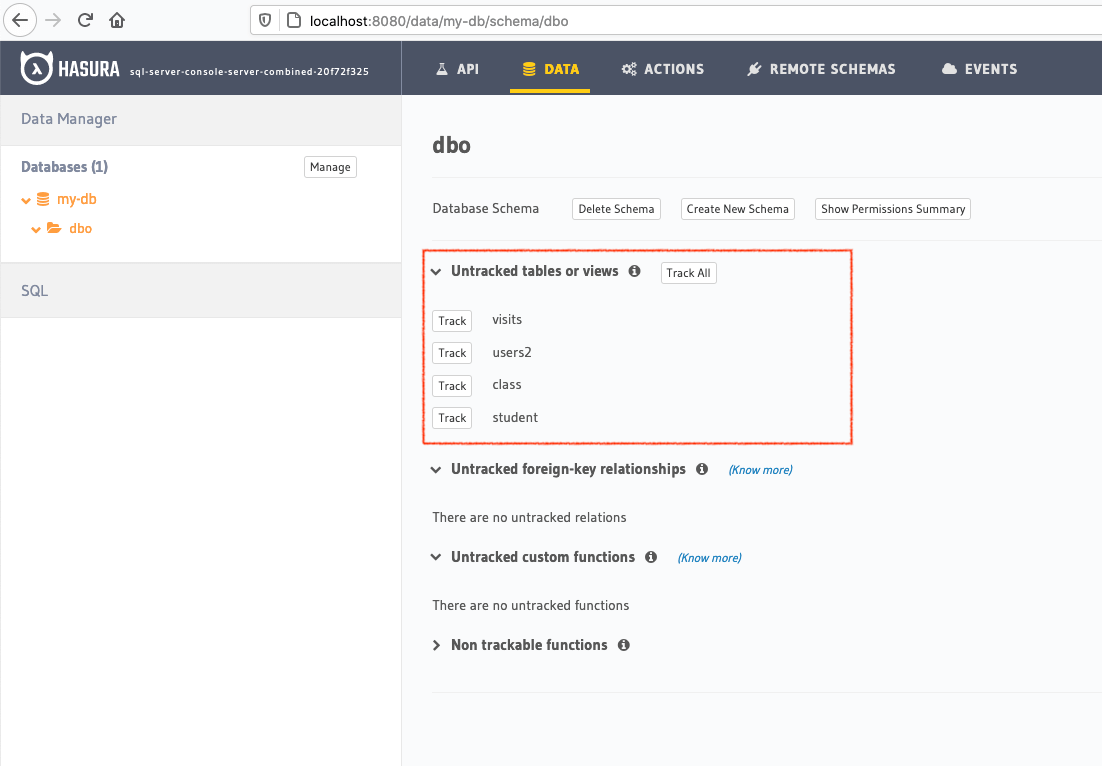 Hasura supports queries, subscriptions, relationships and permissions on MS SQL Server.