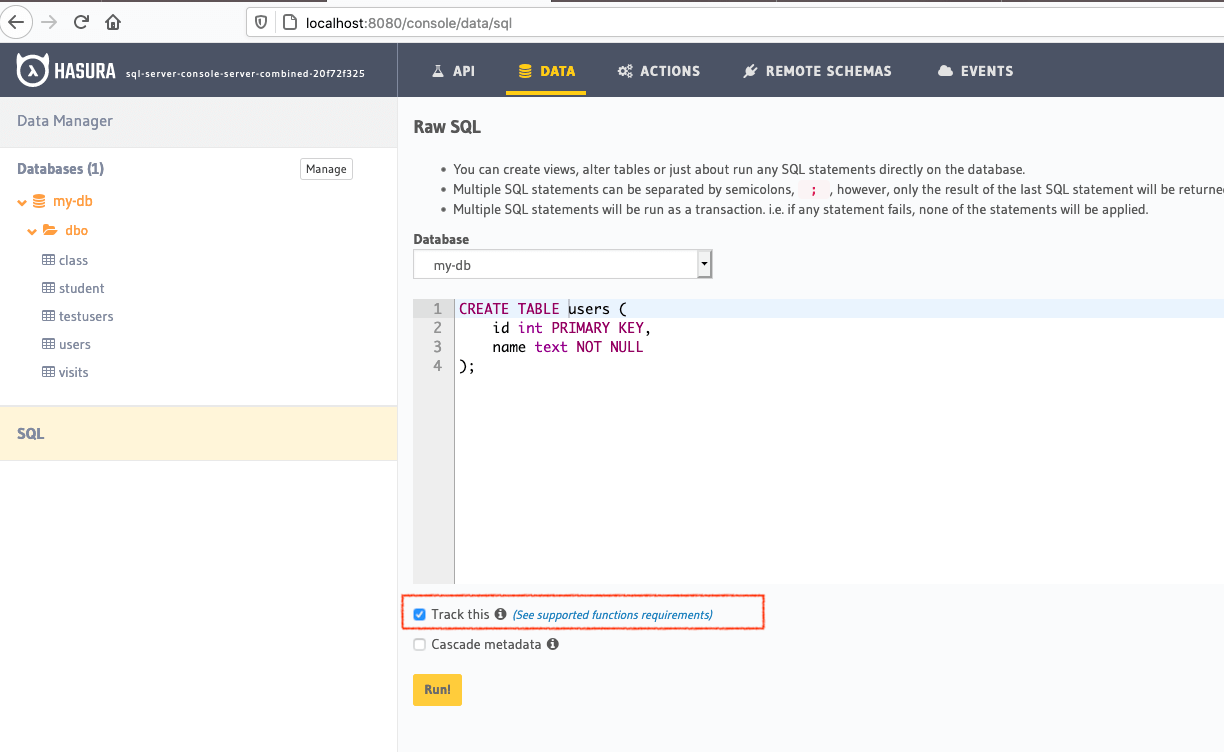 If you’re running raw SQL queries to create your tables, Don’t forget to check “track metadata” at the bottom of the Run SQL window to make sure Hasura tracks your new database objects in its GraphQL schema.