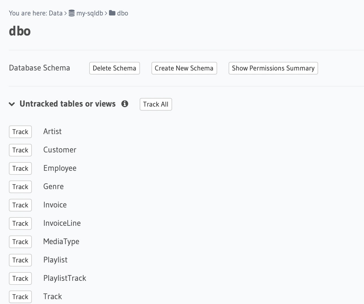 To track the table and expose it over the GraphQL API, make the following API call to the mssql_track_table metadata API: