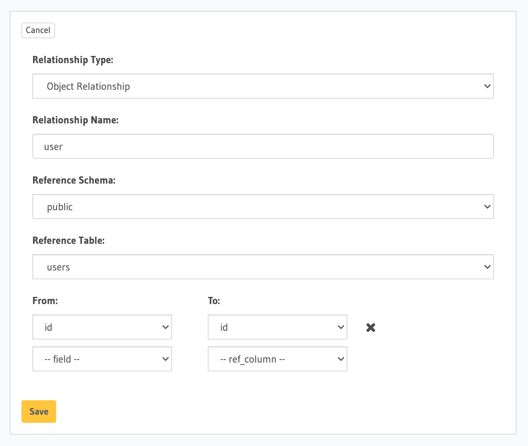 In this example, we’re creating a relationship called user, from the id field returned in the action response, to the id column of the users table.