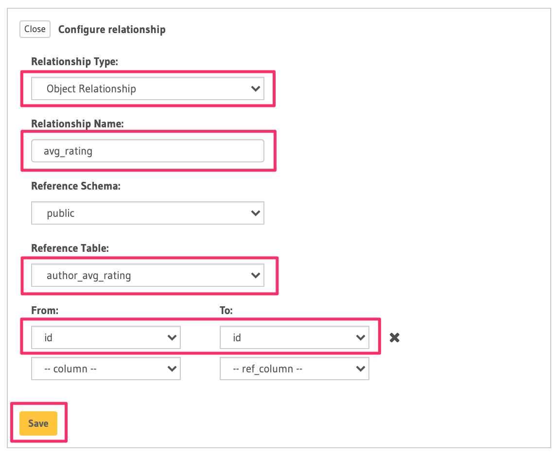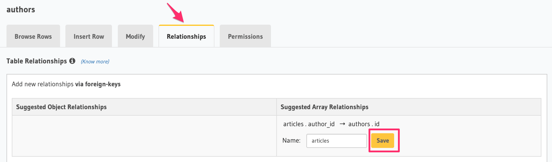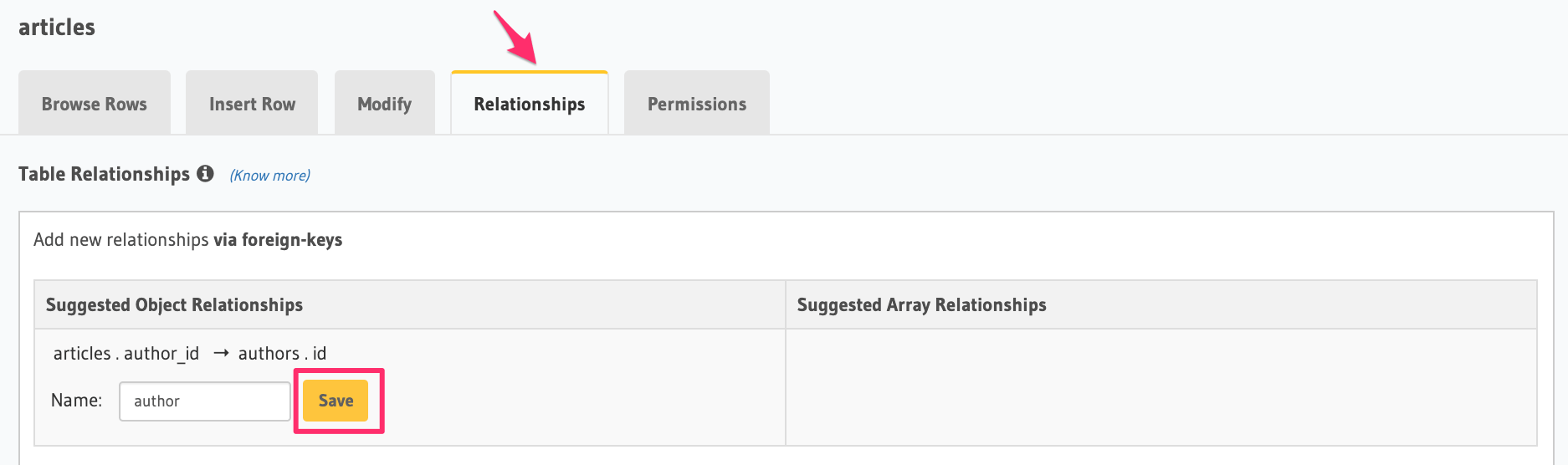 The console infers potential relationships using existing foreign-keys and recommends these on the Data -> Schema