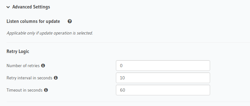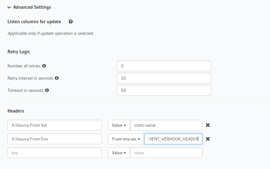section on the Hasura console to define advanced settings for an event trigger: