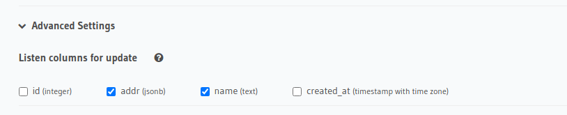 Update operations are special because you may want to trigger a webhook only if specific columns have changed in a row. Choose the columns here which you want the update operation to listen to.