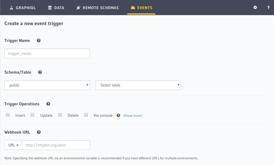Event triggers can be created using the Hasura console, CLI or metadata APIs.