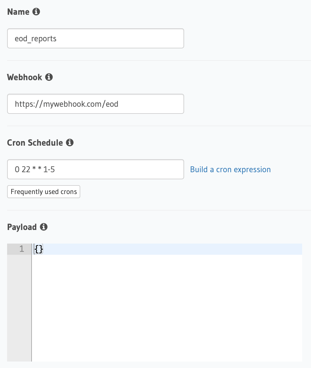 dropdown as a shortcut. Cron events are created based on the UTC timezone. - Payload: The JSON payload which will be sent to the webhook.